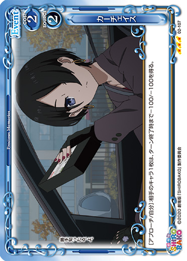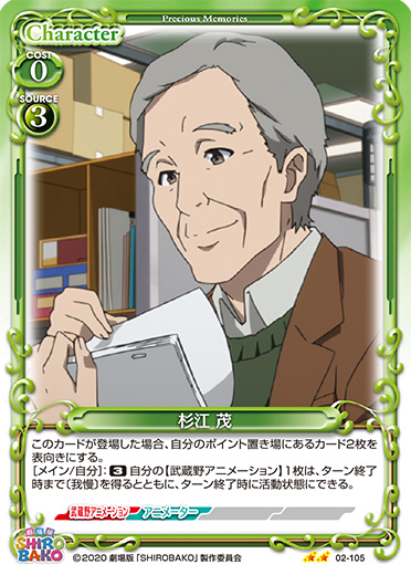 | このカードが登場した場合、ターン終了時に自分の全ての【武蔵野アニメーション】を活動状態にする。 | ||