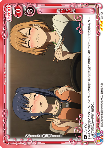 | このカードが登場した場合、自分のポイント置き場にあるカード2枚を表向きにする。[メイン/自分]:《3》自分の【武蔵野アニメーション】1枚は、ターン終了時まで〔我慢〕を得るとともに、ターン終了時に活動状態にできる。 | ||