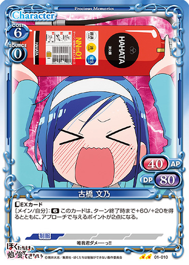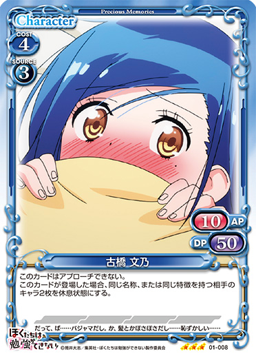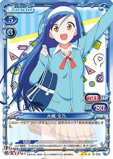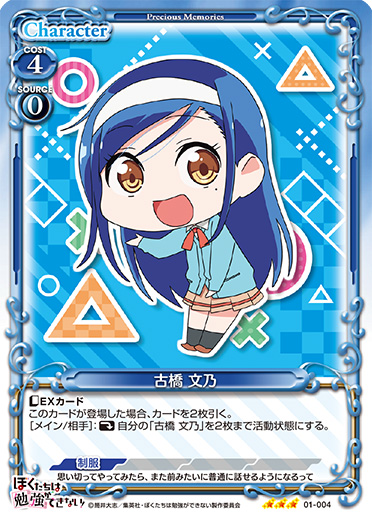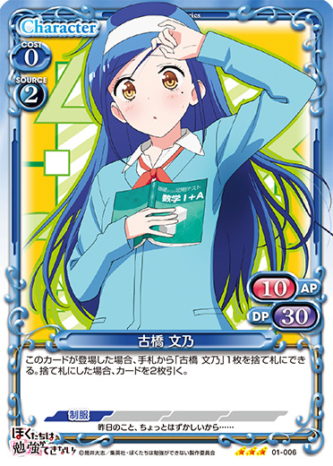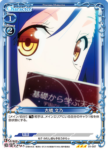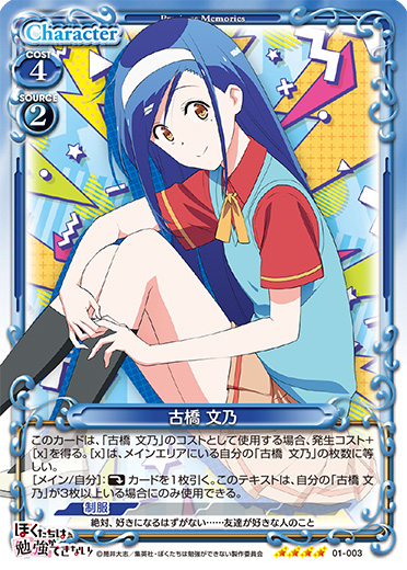 | このカードが登場した場合、EXデッキから『ぼくたちは勉強ができない!』のキャラ1枚を抜き出し、手札に移す。このカードが退場した場合、自分の「古橋 文乃」1枚を活動状態にする。 | ||