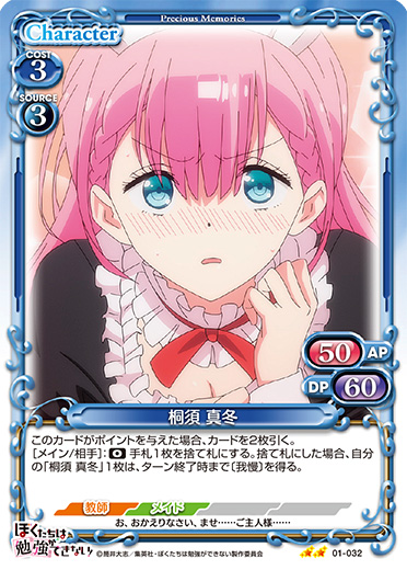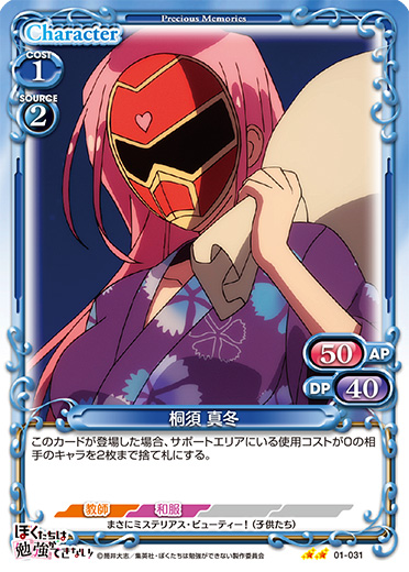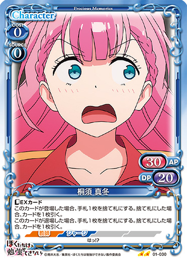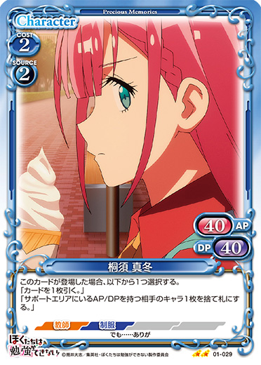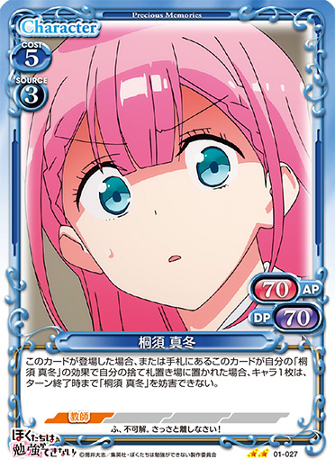 | このカードが登場した場合、または手札にあるこのカードが自分の「桐須 真冬」の効果で自分の捨て札置き場に置かれた場合、キャラ1枚は、ターン終了時まで「桐須 真冬」を妨害できない。 | ||