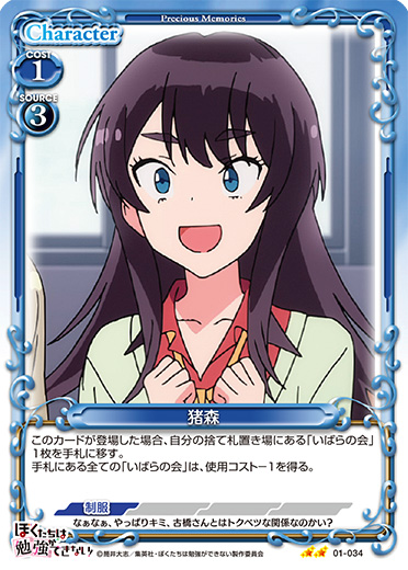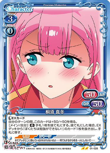 | 〔EXカード〕自分のターンの間、このカードは+50/+50を得る。[メイン/自分]:《0》手札1枚を捨て札にする。捨て札にした場合、EXデッキから『ぼくたちは勉強ができない!』のカード1枚を抜き出し、手札に移す。 | ||
