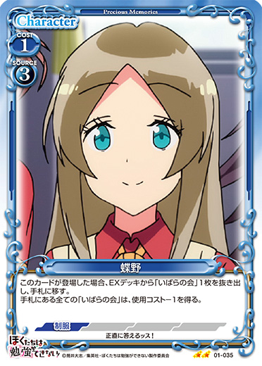 | 〔突破30〕相手は、このカードのアプローチを可能な限り妨害しなければならない。[アプローチ/割り込み]:「緒方 理珠」▸相手のプレイ中のキャラ1枚を無効にする。このテキストは、自分のターンの間にのみ使用できる。 | ||
