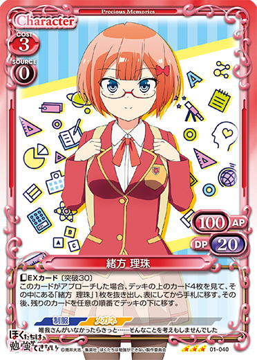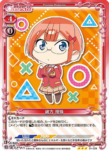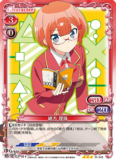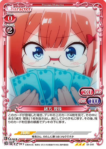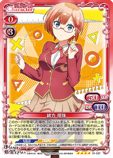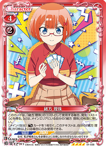 | このカードは、「緒方 理珠」のコストとして使用する場合、発生コスト+[x]を得る。[x]は、メインエリアにいる自分の「緒方 理珠」の枚数に等しい。[メイン/自分]:《休》カードを1枚引く。このテキストは、自分の「緒方 理珠」が3枚以上いる場合にのみ使用できる。 | ||