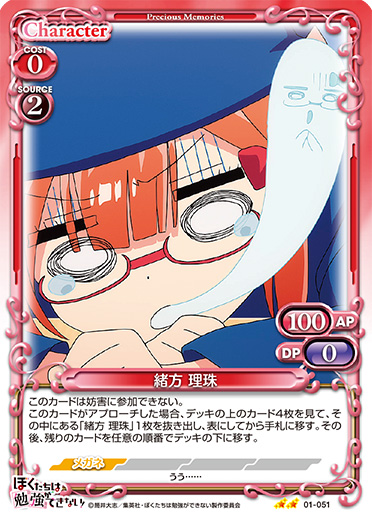 | このカードは妨害に参加できない。このカードがアプローチした場合、デッキの上のカード4枚を見て、その中にある「緒方 理珠」1枚を抜き出し、表にしてから手札に移す。その後、残りのカードを任意の順番でデッキの下に移す。 | ||