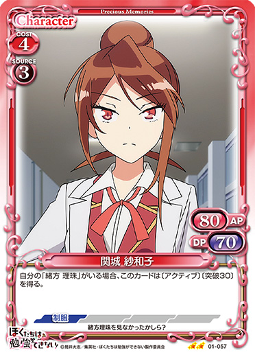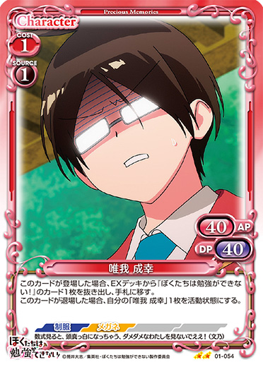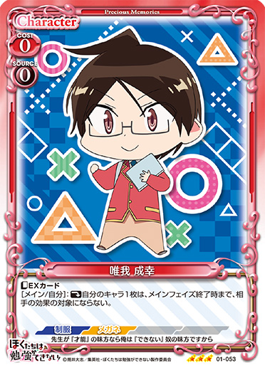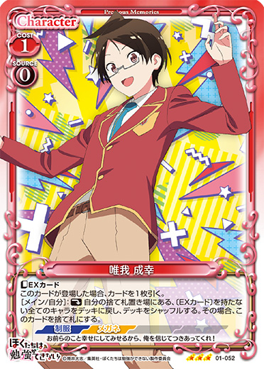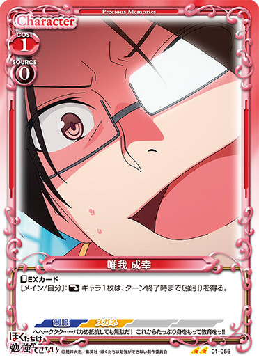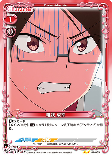 | このカードが登場した場合、EXデッキから『ぼくたちは勉強ができない!』のカード1枚を抜き出し、手札に移す。このカードが退場した場合、自分の「唯我 成幸」1枚を活動状態にする。 | ||