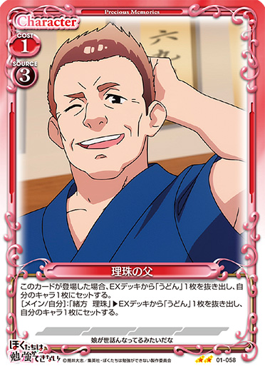 | このカードが登場した場合、EXデッキから「うどん」1枚を抜き出し、自分のキャラ1枚にセットする。[メイン/自分]:「緒方 理珠」▸EXデッキから「うどん」1枚を抜き出し、自分のキャラ1枚にセットする。 | ||