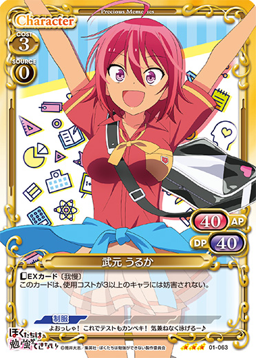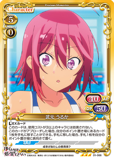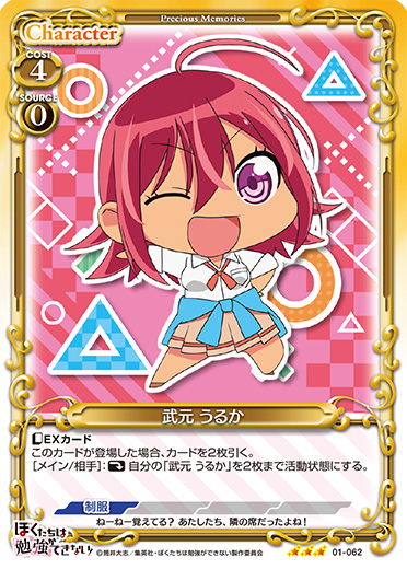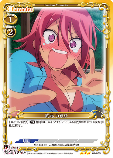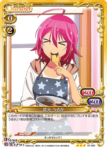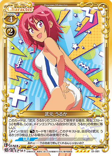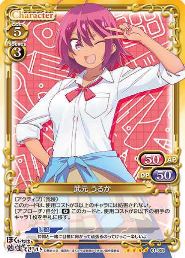 | このカードが登場した場合、このターン、自分が次にプレイする「武元 うるか」1枚は使用コスト-3を得る。 | ||