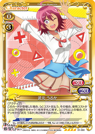 | 〔アクティブ〕このカードが登場した場合、[x]コスト支払う。その場合、使用コストが[x]以下の相手のキャラ1枚を手札に移す。[x]が5以上の場合、EXデッキから「武元 うるか」を2枚まで抜き出し、手札に移す。 | ||