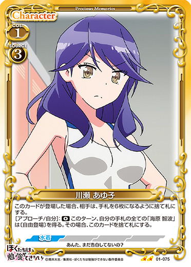 | このカードが登場した場合、手札にある「武元 うるか」1枚を場に出すことができる。[アプローチ/自分]:《0》このターン、自分の手札の全ての「川瀬 あゆ子」は〔自由登場〕を得る。その場合、このカードを捨て札にする。 | ||