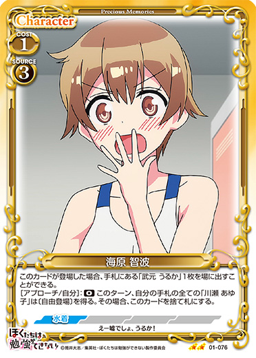 | このカードが登場した場合、相手は、手札を6枚になるように捨て札にする。[アプローチ/自分]:《0》このターン、自分の手札の全ての「海原 智波」は〔自由登場〕を得る。その場合、このカードを捨て札にする。 | ||