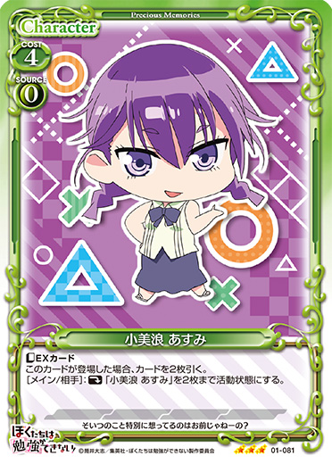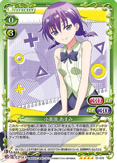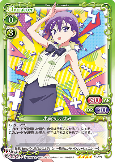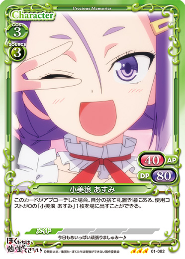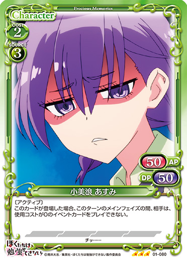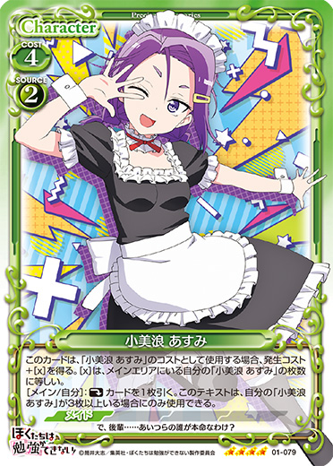 | このカードがアプローチした場合、自分の捨て札置き場にある、使用コストが0の「小美浪 あすみ」1枚を場に出すことができる。 | ||