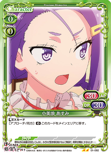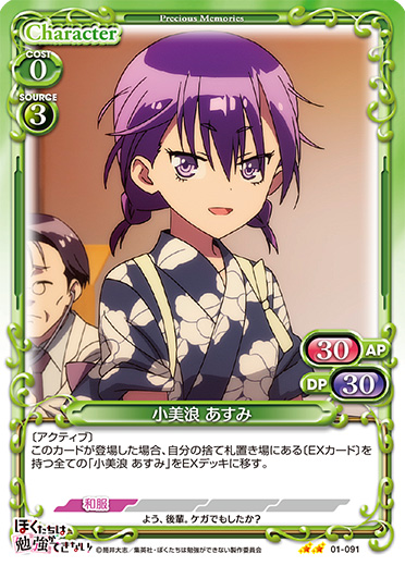| 〔アクティブ〕このカードが登場した場合、自分の捨て札置き場にある〔EXカード〕を持つ全ての「小美浪 あすみ」をEXデッキに移す。 | ||