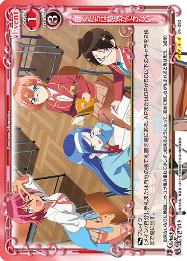 | 〔ブレイク〕[メイン/自分]:手札または自分の捨て札置き場にある、APまたはDPが50以下のキャラを2枚まで場に出す。 | ||