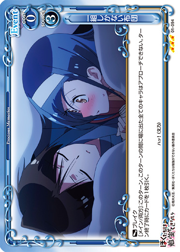 | 〔ブレイク〕[メイン/両方]:このターン、このターンの間に場に出た全てのキャラはアプローチできない。ターン終了時にカードを1枚引く。 | ||