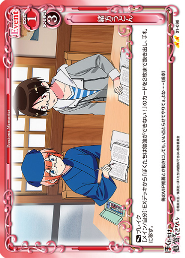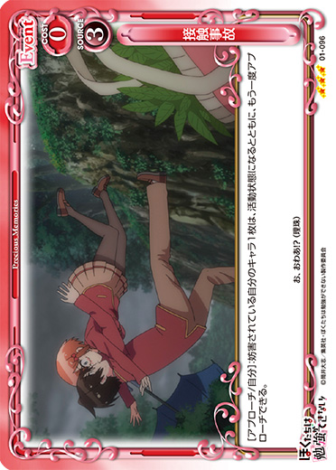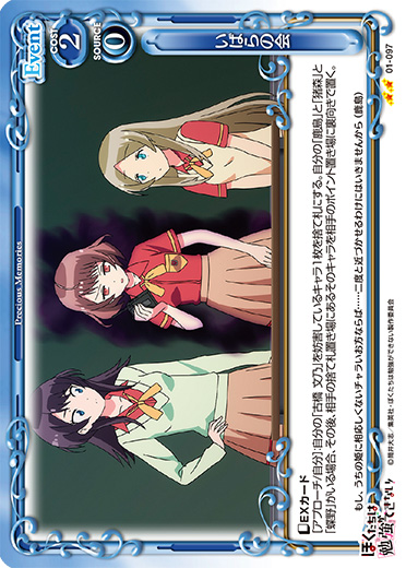 | 〔EXカード〕[アプローチ/自分]:自分の「古橋 文乃」を妨害しているキャラ1枚を捨て札にする。自分の「鹿島」と「猪森」と「蝶野」がいる場合、その後、相手の捨て札置き場にあるそのキャラを相手のポイント置き場に裏向きで置く。 | ||