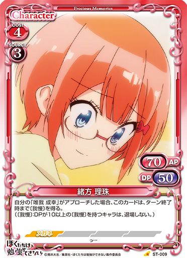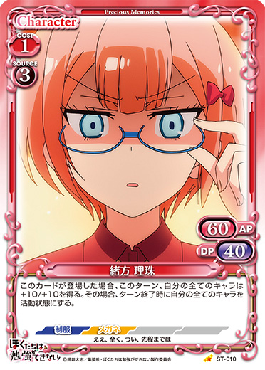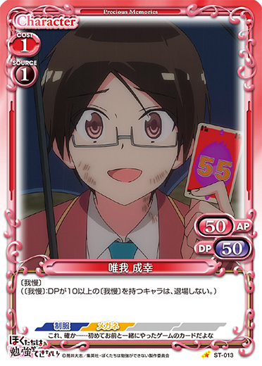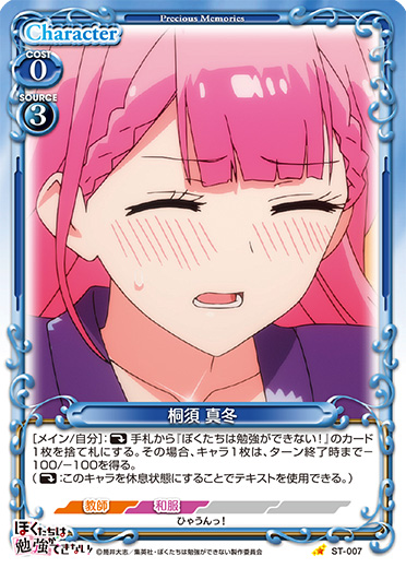 | [メイン/自分]:《休》手札から『ぼくたちは勉強ができない!』のカード1枚を捨て札にする。その場合、キャラ1枚は、ターン終了時まで-100/-100を得る。(《休》:このキャラを休息状態にすることでテキストを使用できる。) | ||