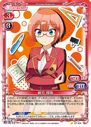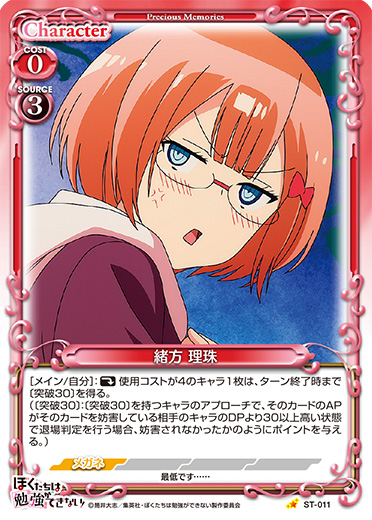| このカードが退場した場合、デッキの上のカード5枚を見て、その中にある『ぼくたちは勉強ができない!』のカード2枚を抜き出し、表にしてから手札に移す。その後、残りのカードを任意の順番でデッキの下に移す。 | ||