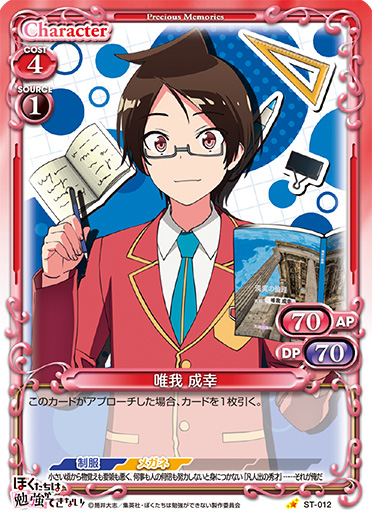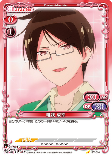 | 自分の「唯我 成幸」がアプローチした場合、このカードは、ターン終了時まで〔我慢〕を得る。(〔我慢〕:DPが10以上の〔我慢〕を持つキャラは、退場しない。) | ||