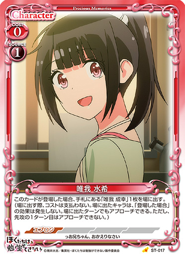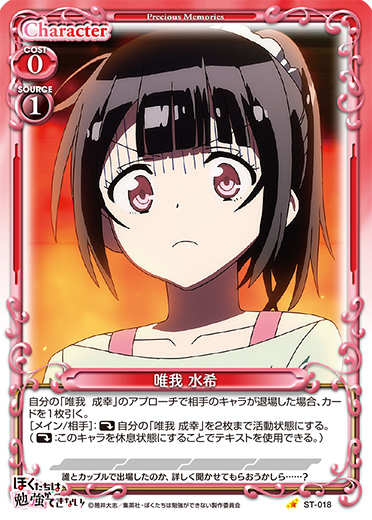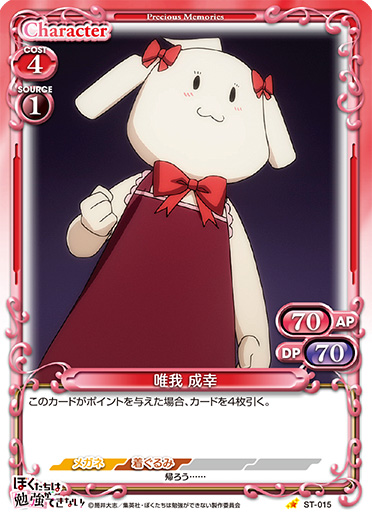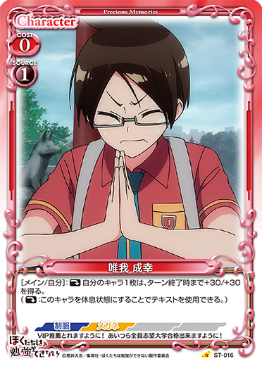 | 自分の「唯我 成幸」のアプローチで相手のキャラが退場した場合、カードを1枚引く。[メイン/相手]:《休》自分の「唯我 成幸」を2枚まで活動状態にする。(《休》:このキャラを休息状態にすることでテキストを使用できる。) | ||