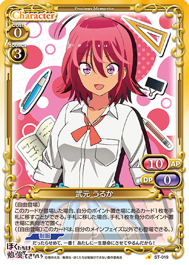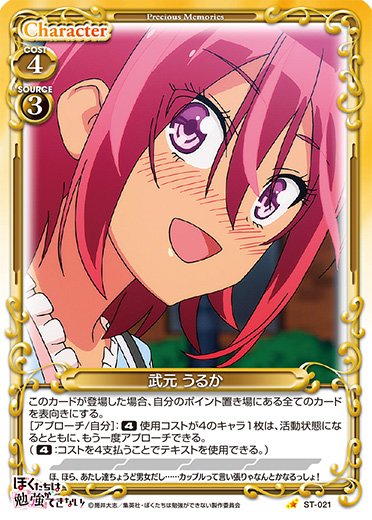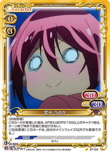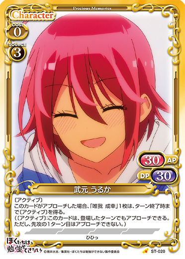 | 〔アクティブ〕このカードがアプローチした場合、「唯我 成幸」1枚は、ターン終了時まで〔アクティブ〕を得る。(〔アクティブ〕:このカードは、登場したターンでもアプローチできる。ただし、先攻の1ターン目はアプローチできない。) | ||