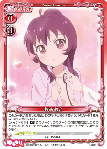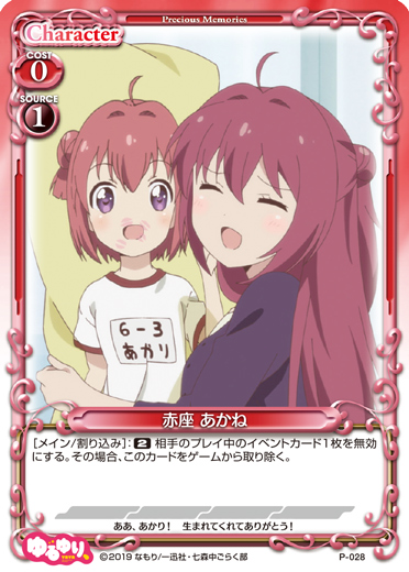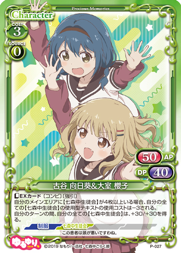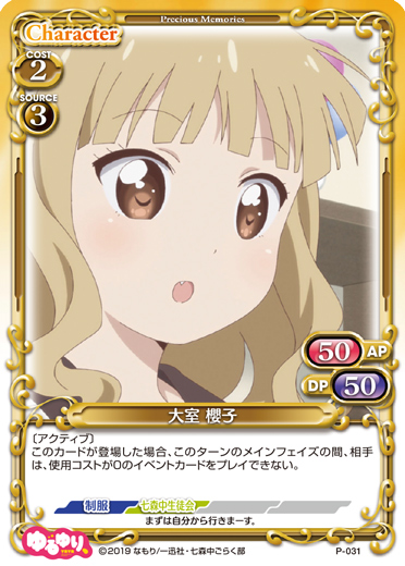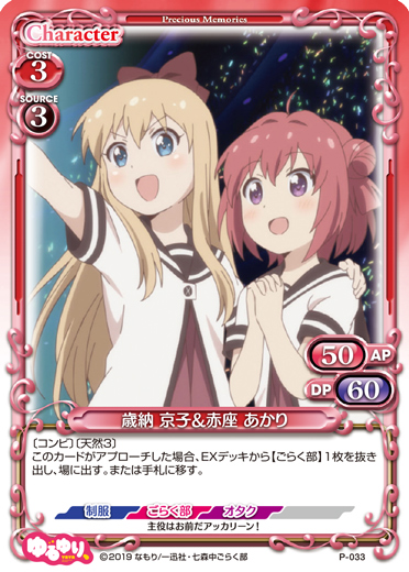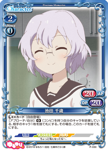 | このカードが登場した場合、EXデッキから『ゆるゆり、』のカード1枚を抜き出し、手札に移す。[メイン/相手]:《0》このターン、このターンの間に場に出た全てのキャラは、アプローチできない。その場合、このカードをゲームから取り除く。 | ||