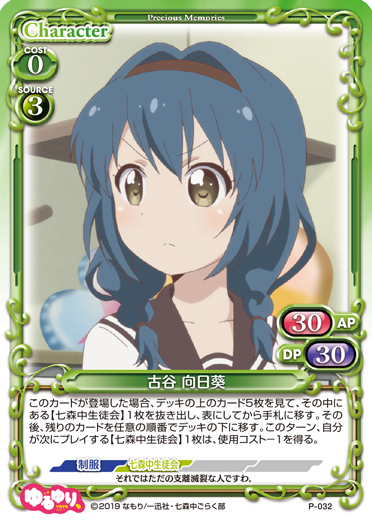 | 〔コンビ〕このカードが登場した場合、手札1枚を捨て札にできる。捨て札にした場合、ターン終了時にデッキの中を全て見て、その中にある使用コストが1以下の、【七森中生徒会】または「船見 結衣」を2枚まで抜き出し、サポートエリアに出す。その後、デッキをシャッフルする。 | ||