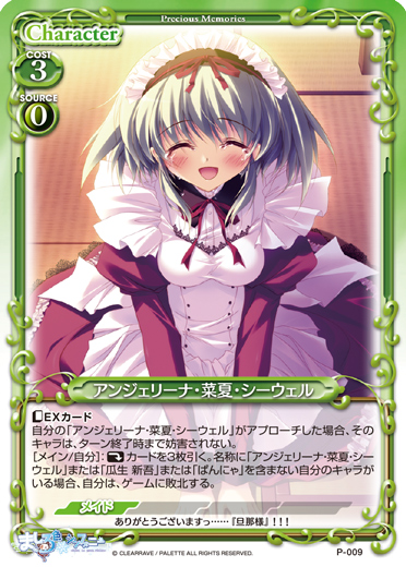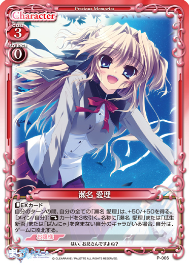 | 〔EXカード〕自分のターンの間、自分の全ての「瀬名 愛理」は、+50/+50を得る。[メイン/自分]:《休》カードを3枚引く。名称に「瀬名 愛理」または「瓜生 新吾」または「ぱんにゃ」を含まない自分のキャラがいる場合、自分は、ゲームに敗北する。 | ||