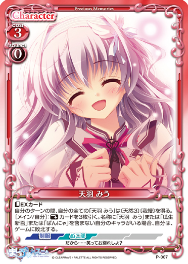 | 〔EXカード〕自分のターンの間、自分の全ての「天羽 みう」は〔天然3〕〔我慢〕を得る。[メイン/自分]:《休》カードを3枚引く。名称に「天羽 みう」または「瓜生 新吾」または「ぱんにゃ」を含まない自分のキャラがいる場合、自分は、ゲームに敗北する。 | ||