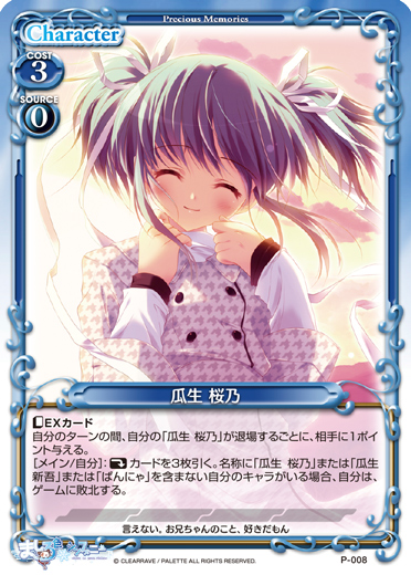| 〔EXカード〕自分のターンの間、自分の「瓜生 桜乃」が退場するごとに、相手に1ポイント与える。[メイン/自分]:《休》カードを3枚引く。名称に「瓜生 桜乃」または「瓜生 新吾」または「ぱんにゃ」を含まない自分のキャラがいる場合、自分は、ゲームに敗北する。 | ||