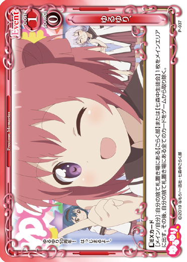 | 〔EXカード〕[メイン/自分]:自分の捨て札置き場にある【ごらく部】または【七森中生徒会】1枚をメインエリアに出す。その後、自分の捨て札置き場にある全てのカードをゲームから取り除く。 | ||