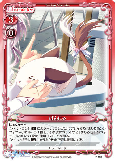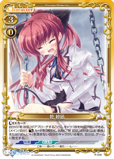 | 〔EXカード〕自分の「乾 紗凪」がアプローチするごとに、キャラ1枚を休息状態にできる。[メイン/自分]:《休》カードを3枚引く。名称に「乾 紗凪」または「瓜生 新吾」または「ぱんにゃ」を含まない自分のキャラがいる場合、自分は、ゲームに敗北する。 | ||