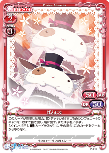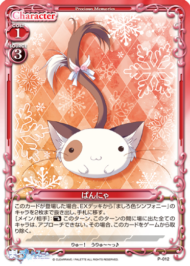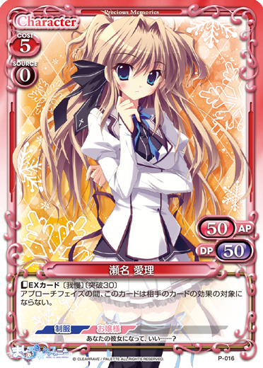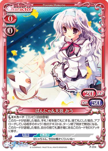 | 〔EXカード〕〔コンビ〕〔自由登場〕このカードが妨害した場合、手札1枚を捨て札にする。捨て札にした場合、アプローチしている相手のキャラ1枚のテキストは、ターン終了時まで無効になる。このカードが退場した場合、自分の捨て札置き場にあるこのカードをEXデッキに移す。 | ||