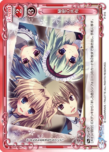 | このカードが登場した場合、EXデッキから『ましろ色シンフォニー』のキャラを2枚まで抜き出し、手札に移す。[メイン/相手]:《休》このターン、このターンの間に場に出た全てのキャラは、アプローチできない。その場合、このカードをゲームから取り除く。 | ||