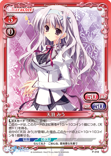 | 〔EXカード〕〔天然0〕〔我慢〕このカードは、このカードの上にある+10/+10コイン1個につき、〔天然+1〕を得る。自分の「天羽 みう」が登場した場合、このカードの上に+10/+10コインを1個乗せる。 | ||
