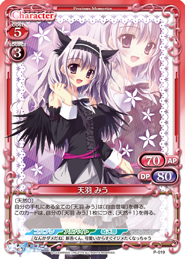 | 〔天然0〕自分の手札にある全ての「天羽 みう」は〔自由登場〕を得る。このカードは、自分の「天羽 みう」1枚につき、〔天然+1〕を得る。 | ||