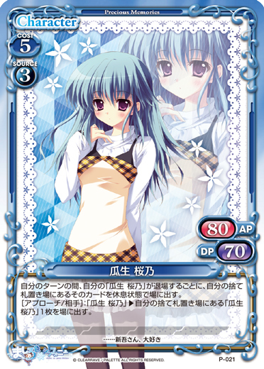 | 自分のターンの間、自分の「瓜生 桜乃」が退場するごとに、自分の捨て札置き場にあるそのカードを休息状態で場に出す。[アプローチ/相手]:「瓜生 桜乃」▸ 自分の捨て札置き場にある「瓜生 桜乃」1枚を場に出す。 | ||