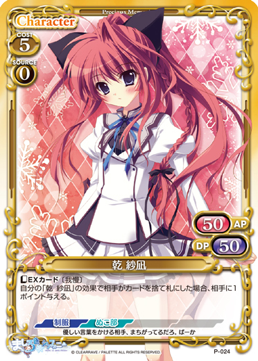 | 〔EXカード〕〔我慢〕自分の「乾 紗凪」の効果で相手がカードを捨て札にした場合、相手に1ポイント与える。 | ||