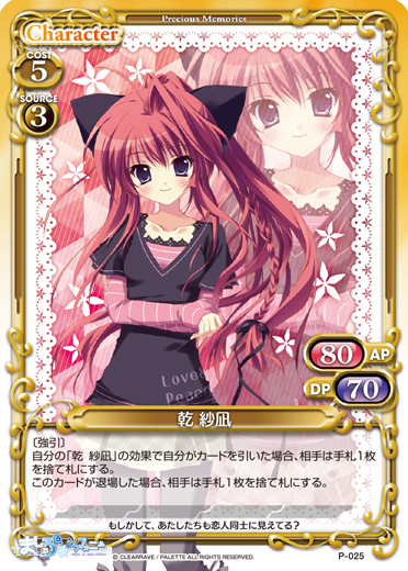 | 〔強引〕自分の「乾 紗凪」の効果で自分がカードを引いた場合、相手は手札1枚を捨て札にする。このカードが退場した場合、相手は手札1枚を捨て札にする。 | ||