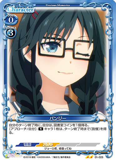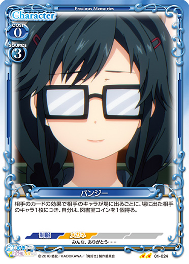 | 相手のカードの効果で相手のキャラが場に出るごとに、場に出た相手のキャラ1枚につき、自分は、図書室コインを1個得る。 | ||