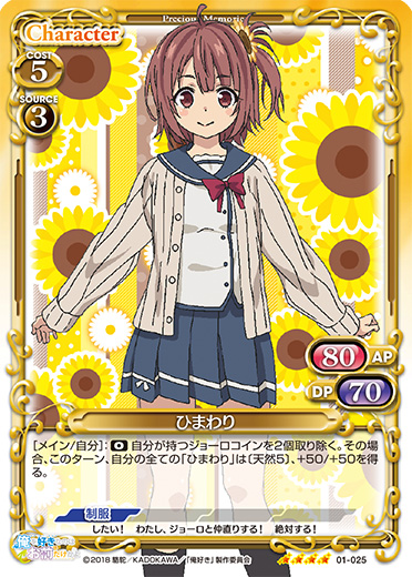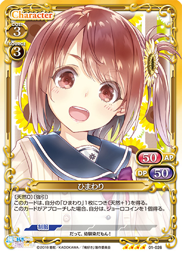 | 〔天然0〕〔強引〕このカードは、自分の「ひまわり」1枚につき〔天然+1〕を得る。このカードがアプローチした場合、自分は、ジョーロコインを1個得る。 | ||