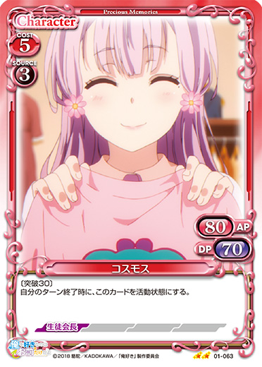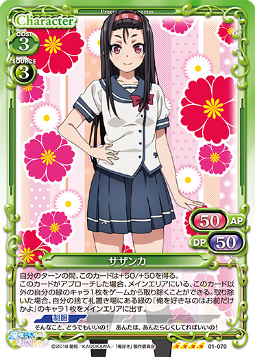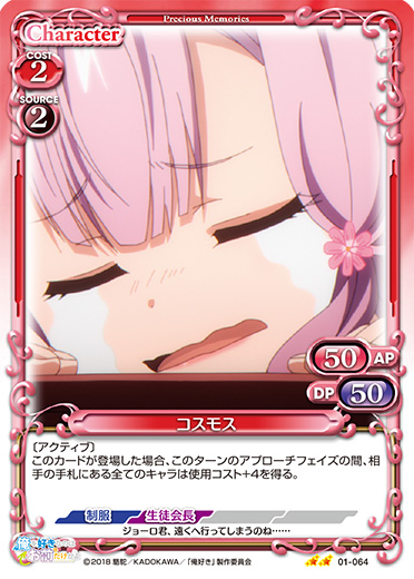 | 自分のターンの間、このカードは+50/+50を得る。このカードがアプローチした場合、メインエリアにいる、このカード以外の自分の緑のキャラ1枚をゲームから取り除くことができる。取り除いた場合、自分の捨て札置き場にある緑の『俺を好きなのはお前だけかよ』のキャラ1枚をメインエリアに出す。 | ||