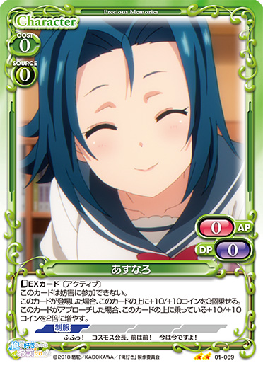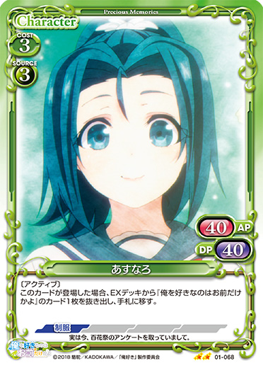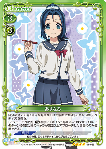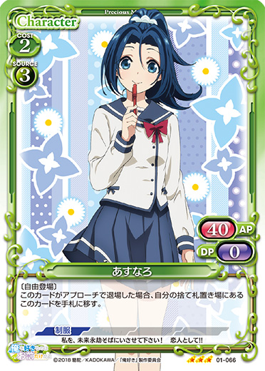 | 自分の全ての緑の『俺を好きなのはお前だけかよ』のキャラは〔アクティブ〕を得る。[アプローチ/自分]:《休》相手に1ポイント与える。このテキストは、このターンの間に緑のキャラが5回以上アプローチした場合にのみ使用できる。 | ||