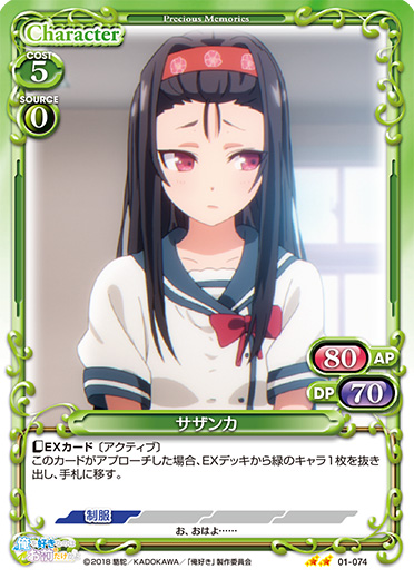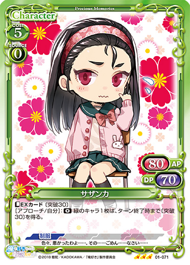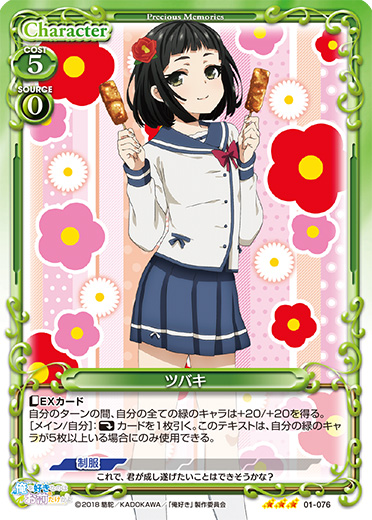 | 〔EXカード〕自分のターンの間、自分の全ての緑のキャラは+20/+20を得る。[メイン/自分]:《休》カードを1枚引く。このテキストは、自分の緑のキャラが5枚以上いる場合にのみ使用できる。 | ||