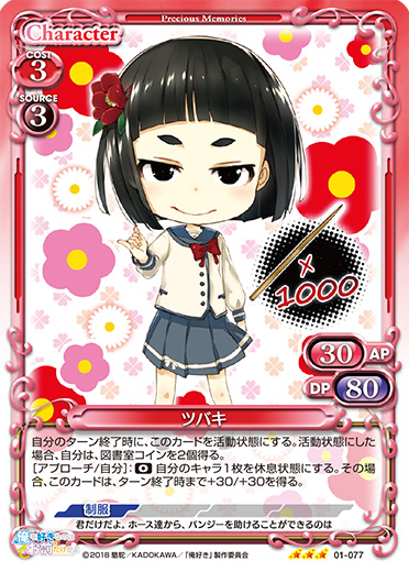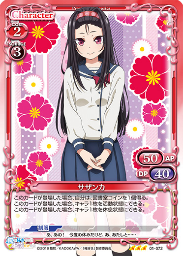 | 自分のターン終了時に、このカードを活動状態にする。活動状態にした場合、自分は、図書室コインを2個得る。[アプローチ/自分]:《0》自分のキャラ1枚を休息状態にする。その場合、このカードは、ターン終了時まで+30/+30を得る。 | ||