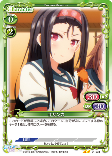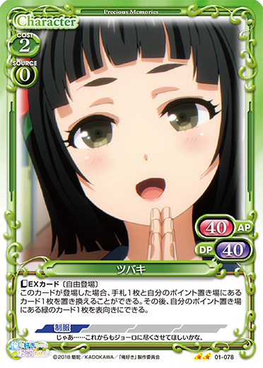 | このカードが登場した場合、このターン、自分が次にプレイする緑のキャラ1枚は、使用コスト-5を得る。 | ||
