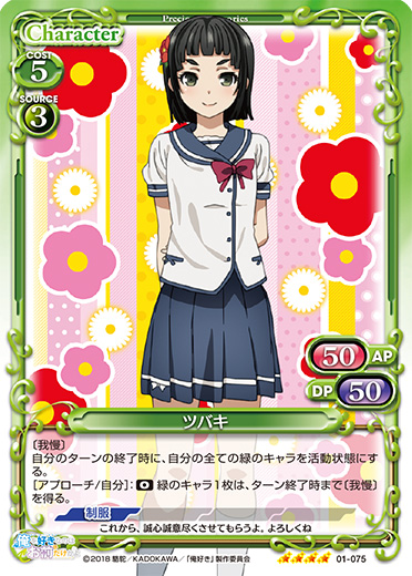 | 〔我慢〕自分のターン終了時に、自分の全ての緑のキャラを活動状態にする。[アプローチ/自分]:《0》緑のキャラ1枚は、ターン終了時まで〔我慢〕を得る。 | ||