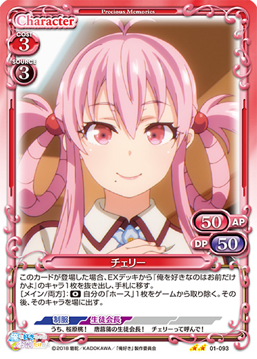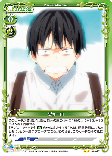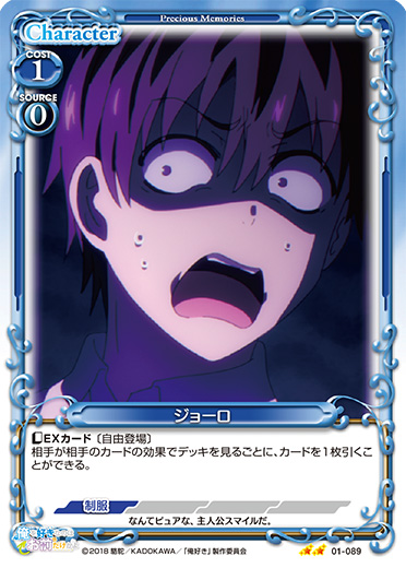 | このカードが登場した場合、EXデッキから『俺を好きなのはお前だけかよ』のキャラ1枚を抜き出し、手札に移す。[メイン/両方]:《0》自分の「ホース」1枚をゲームから取り除く。その後、そのキャラを場に出す。 | ||