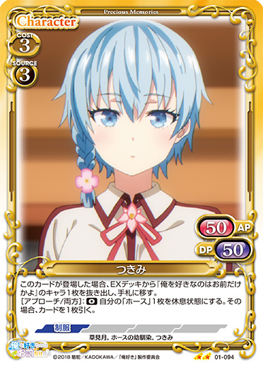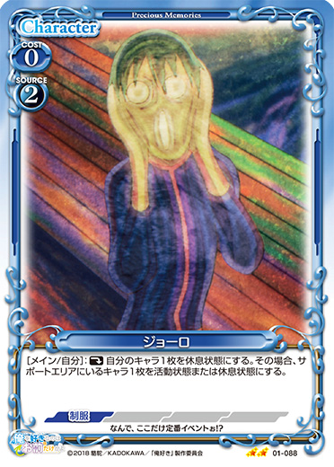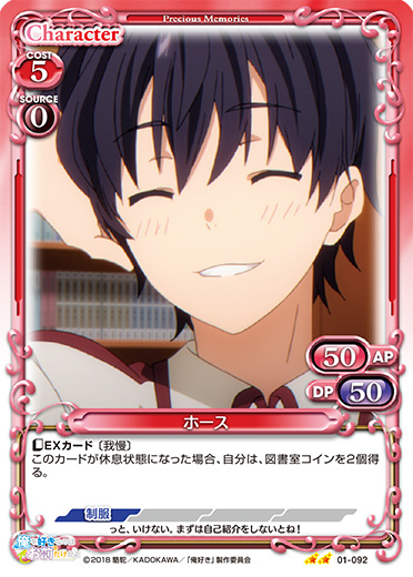 | このカードが登場した場合、EXデッキから『俺を好きなのはお前だけかよ』のキャラ1枚を抜き出し、手札に移す。[アプローチ/両方]:《0》自分の「ホース」1枚を休息状態にする。その場合、カードを1枚引く。 | ||