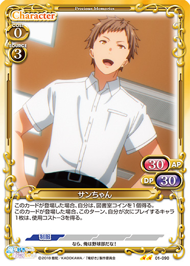 | このカードが登場した場合、自分は、図書室コインを1個得る。このカードが登場した場合、このターン、自分が次にプレイするキャラ1枚は、使用コスト-3を得る。 | ||