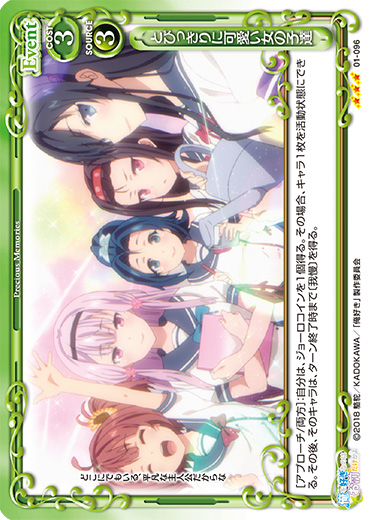 | [アプローチ/両方]:自分は、ジョーロコインを1個得る。その場合、キャラ1枚を活動状態にできる。その後、そのキャラは、ターン終了時まで〔我慢〕を得る。 | ||